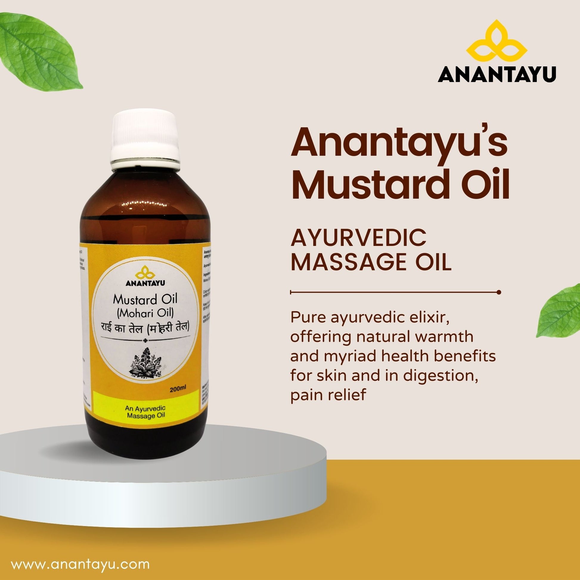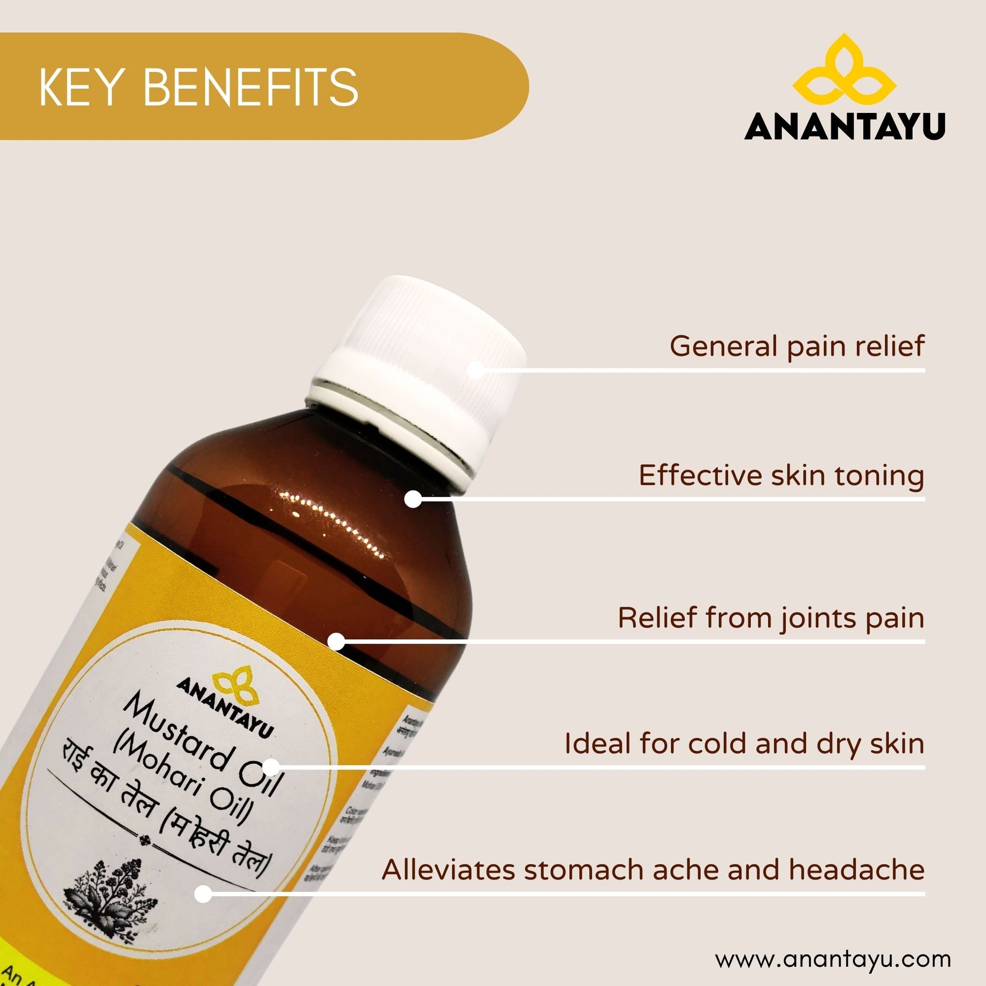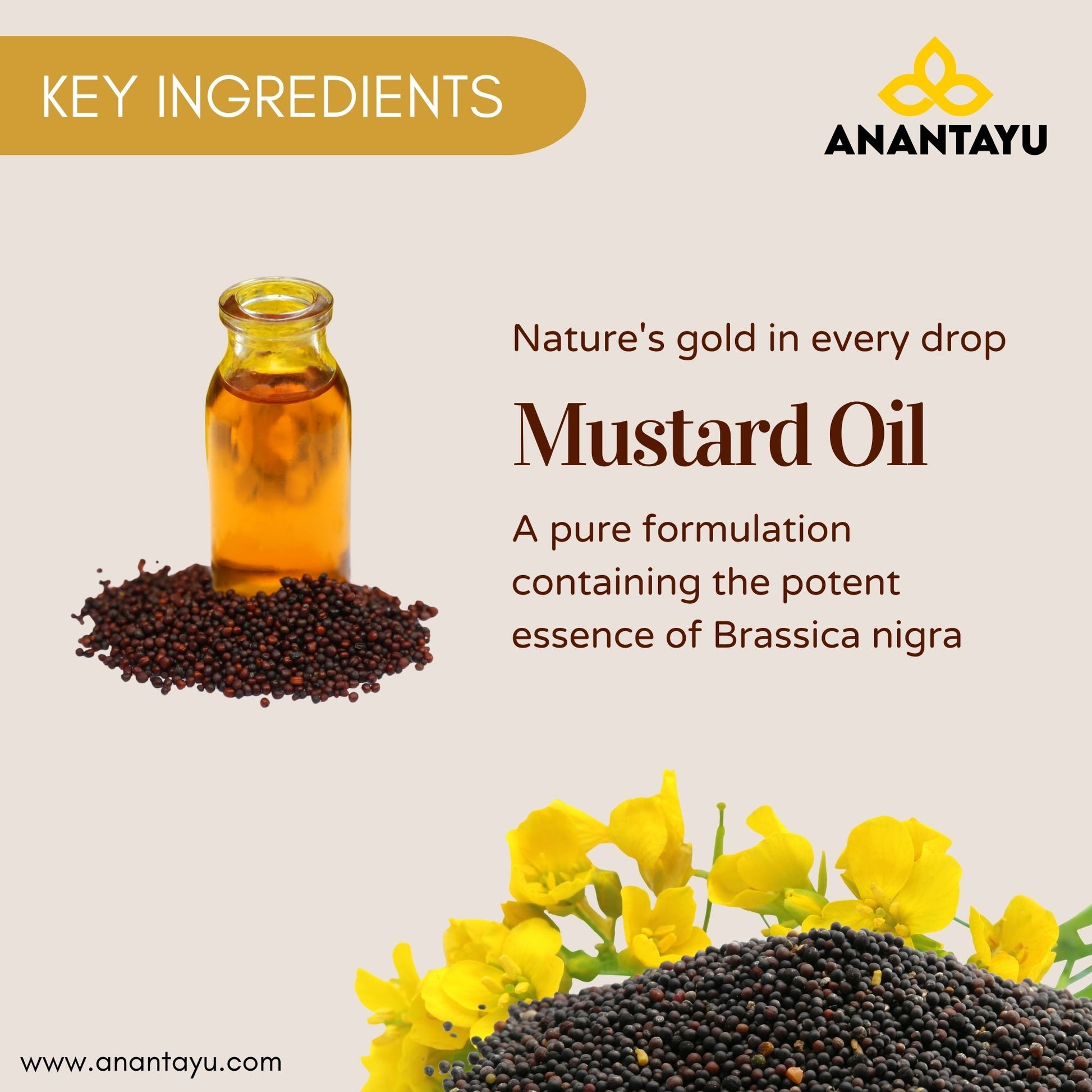 Dive into the therapeutic embrace of Anantayu's Mustard Oil (Mohari Oil). This Ayurvedic formulation is not just an oil, but a harmonious blend of nature's finest, curated to offer skin health enhancing effects.