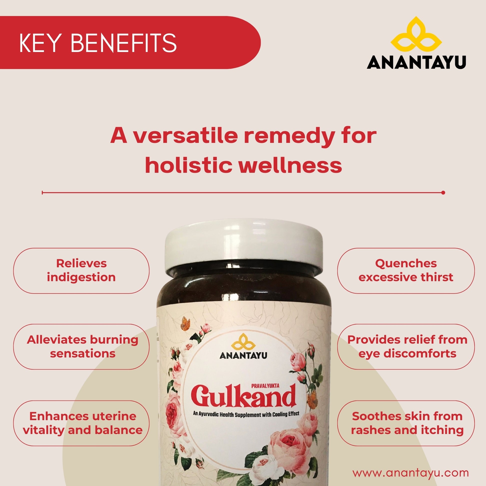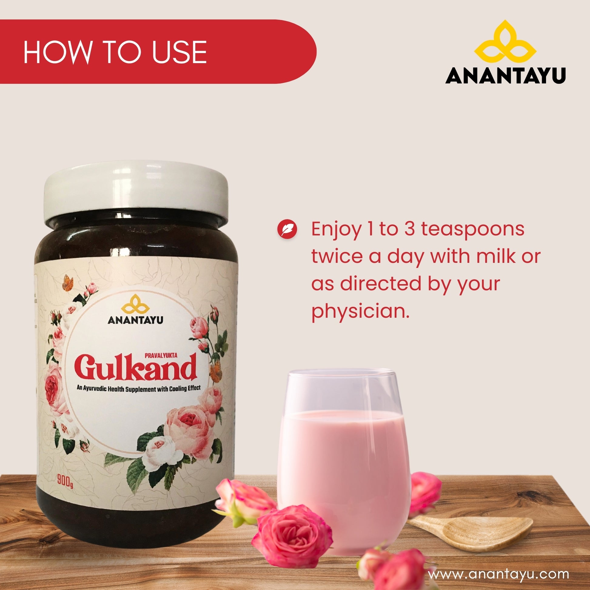 To combat acidity, burning sensations, and indigestion, Gulkand is best consumed approximately half an hour after meals. In cases of bloating, it is suggested to be taken before meals. Furthermore, Gulkand can be ingested as needed when dealing with general debility, urinary disorders, increased palpitations, nosebleeds, and similar conditions.
